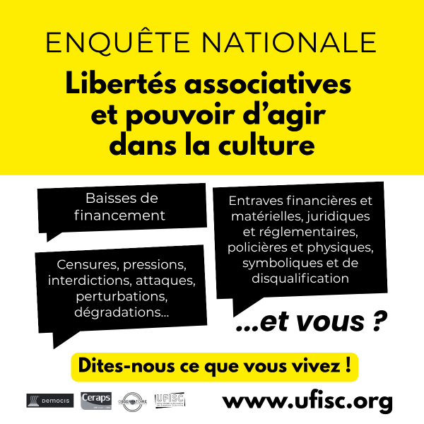 Face à cette situation, un consortium de chercheur∙euses, d’acteur∙ices et d’organisations collectives du secteur culturel, coordonnés par l’Observatoire des Libertés Associatives et l’UFISC, lance une grande enquête nationale portant à la fois sur l’état des libertés associatives et de création des structures artistiques et culturelles du champ de l’Économie Sociale et Solidaire et sur les baisses de financements publics et leur impact sur l’emploi et l’économie des structures.