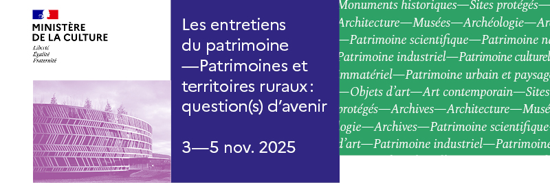 À la suite du succès de la reprise des Entretiens du patrimoine en 2023, la direction générale des Patrimoines et de l’Architecture du ministère de la Culture organise du 3 au 5 novembre 2025 une nouvelle édition sur le thème des patrimoines et des ruralités. Elle donnera aux différents acteurs (architectes, conservateurs, restaurateurs, chercheurs, collectivités locales, entreprises, associations, etc.) l’opportunité de débattre durant trois jours d’une question située au cœur de leurs missions. Cette rencontre se tiendra à la Bibliothèque nationale de France, site François Mitterrand, et pourra aussi être suivie à distance.