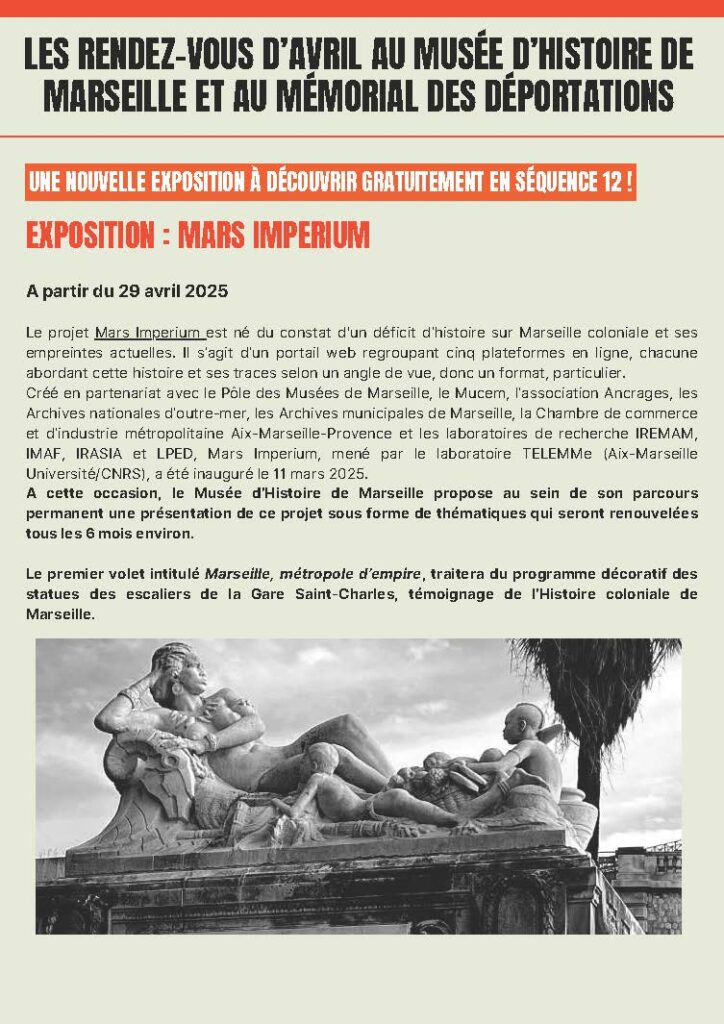 Créé en partenariat avec le Pôle des Musées de Marseille, le Mucem, l’association Ancrages, les Archives nationales d’outre-mer, les Archives municipales de Marseille, la Chambre de commerce et d’industrie métropolitaine Aix-Marseille-Provence et les laboratoires de recherche IREMAM, IMAF, IRASIA et LPED, Mars Imperium, mené par le laboratoire TELEMMe (Aix-Marseille Université/CNRS), a été inauguré le 11 mars 2025.