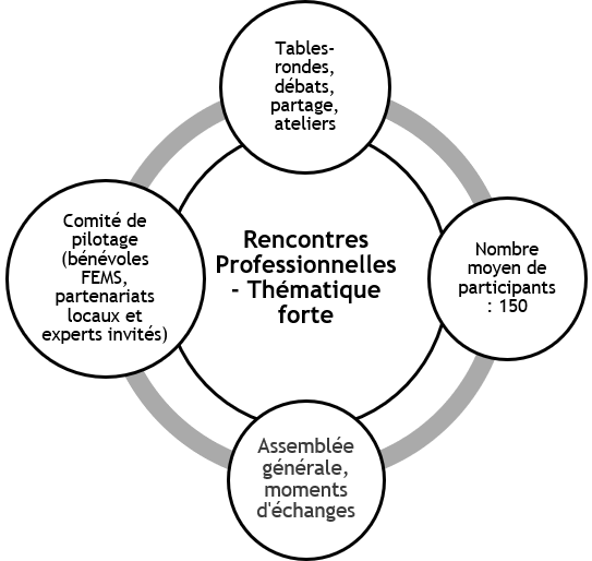 La FEMS organise annuellement des Rencontres Professionnelles nationales. Articulées autour de visites, tables-rondes et ateliers, ces journées, ouvertes à l’ensemble des professionnels de la culture et du tourisme, chercheurs et étudiants, sont un moment privilégié d’échanges et de débats autour de nos pratiques professionnelles. Associées à l’Assemblée Générale de la FEMS les Rencontres constituent un temps fort de la vie du réseau.