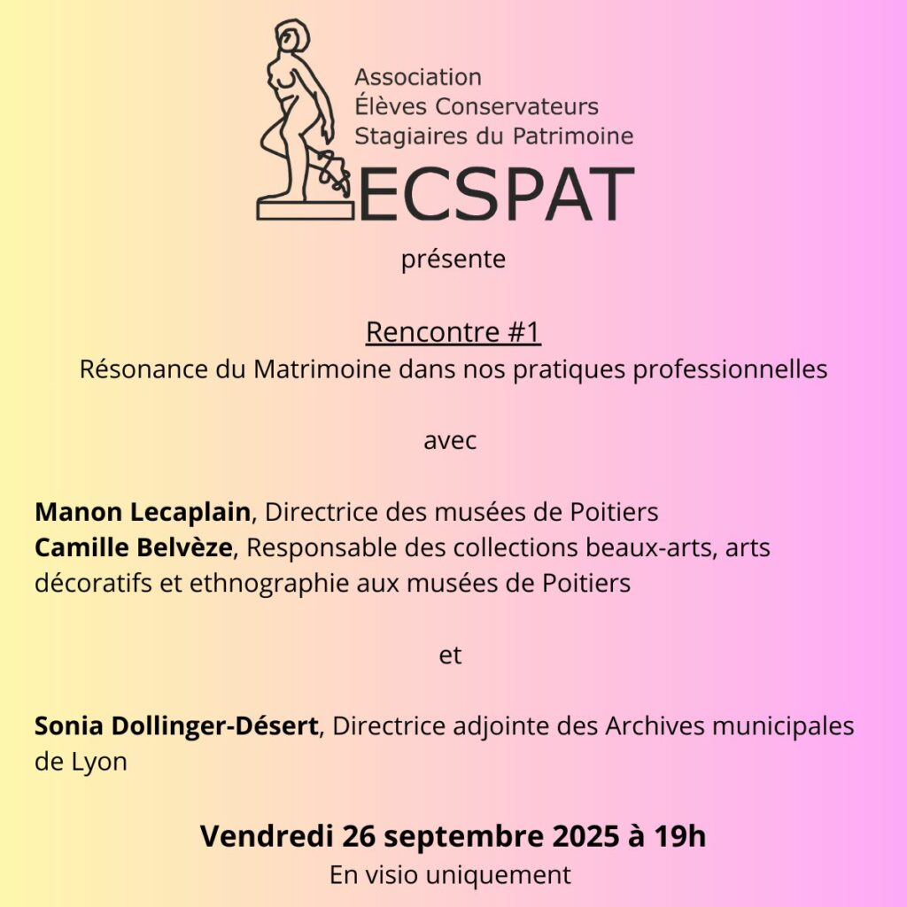 À l’occasion des 10 ans du Matrimoine, l’association des Élèves conservatrices et conservateurs du patrimoine vous propose une nouvelle rencontre avec Manon Lecaplain, Camille Belvèze et Sonia Dollinger-Désert.